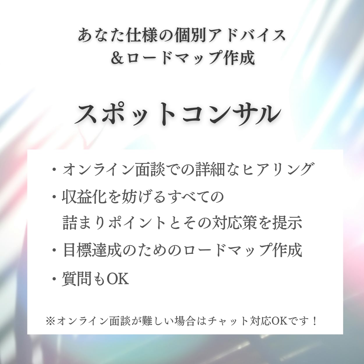 このスポットコンサルでは、あなたの状況を丁寧にヒアリングした上で、収益化を妨げているすべての詰まりポイントを特定し、今後の具体的なロードマップをお渡しします。